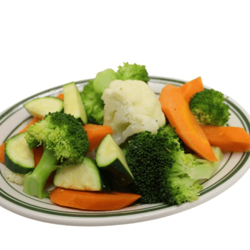 Mixed vegetables containing broccoli, carrots, cauliflower, zucchini, & green beans