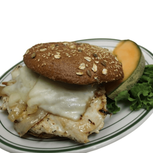 6 oz chicken breast served on honey wheat bun with Jack cheese, caramelized onions, lettuce, & tomatoes