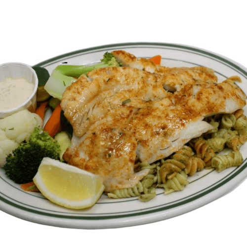 Fresh rock cod served with pasta, vegetables, tartar sauce, and lemon