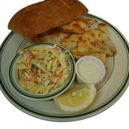 Fresh cod with garlic butter garnished with lettuce and tomatoes on a francese roll. Served with coleslaw, tartar sauce, and lemon