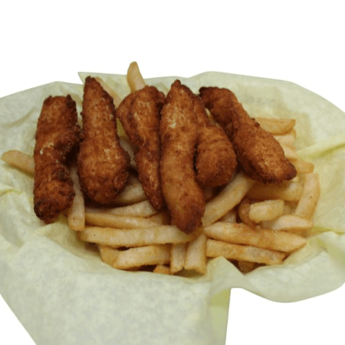Breaded chicken strips served with French fries, ranch, and barbecue sauce